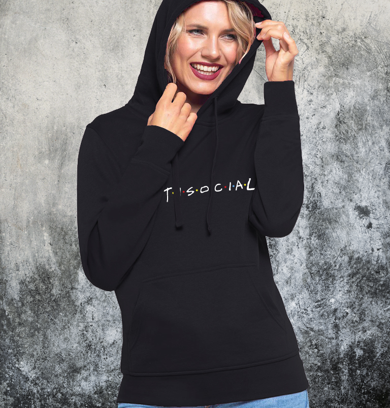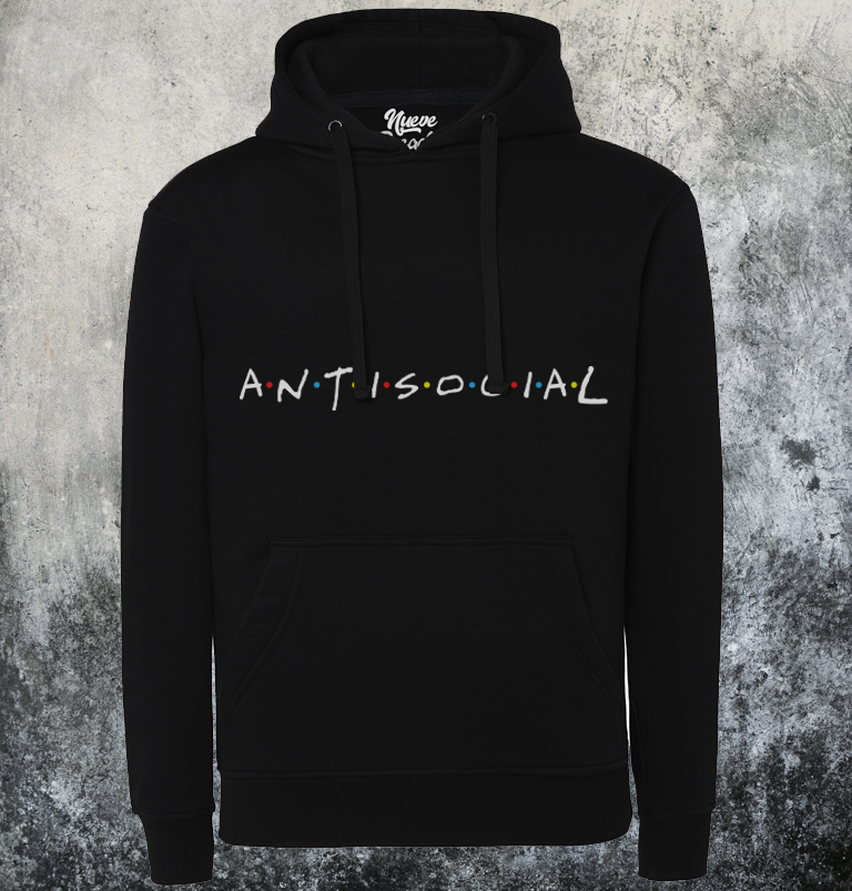 Sudadera con capucha para chica con bolsillo de canguro y cordón de ajuste negro. Con diseño “Antisocial” en la parte frontal.